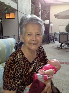 Mom at her new facility in Pasadena, with her baby doll, and her hair cut (courtesy of my very patient brother, and the Flowbee.